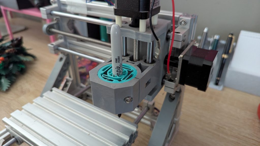 So I recently started a new job at a local science museum as a Maker Educator! We’ve been wanting to introduce guests to CNC routers, but exposing our guests to the noise, dust, and the spinning bit chewing through materials sounds like a bad idea? So what do we do? Well, my wife found two CNC routers missing parts a few years ago! They had been sitting in our basement waiting for a repair: now seemed like a great time to convert them to pen plotters!