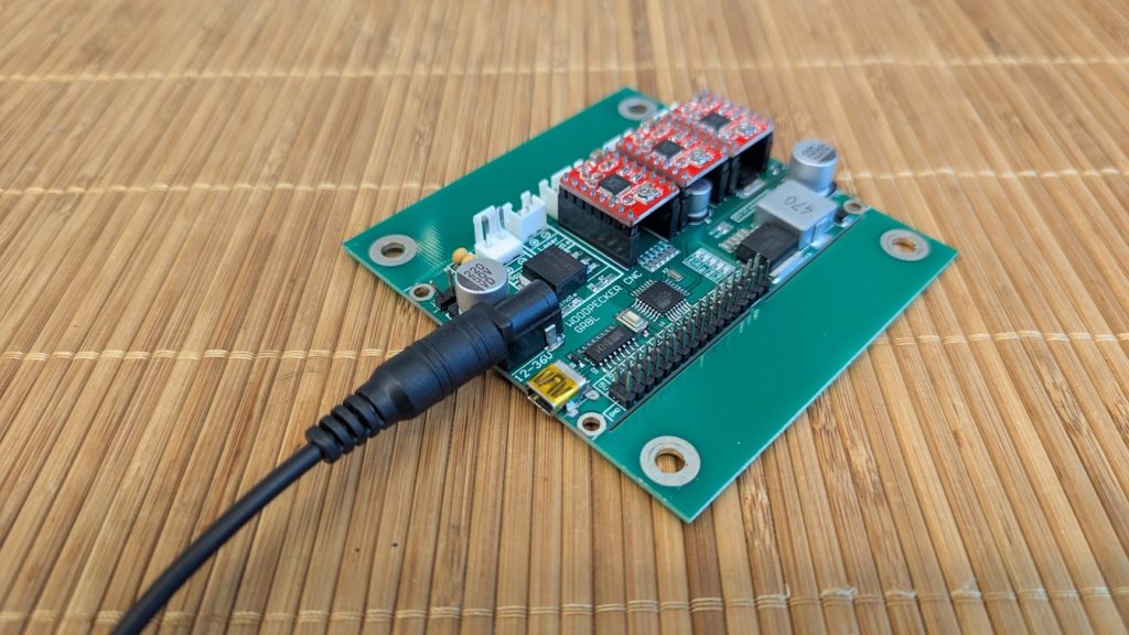 A quick test showed the controller board was still working! The original power supply was missing: I swapped the barrel plug on the board, and set a matching barrel tip on a recycled power supply before testing (and not setting anything on fire). I tested the motors next: jogging them in CandleCNC showed that they were all working, and that the board was running version 0.9 of Grbl (a firmware to control CNC machines). So far so good!
